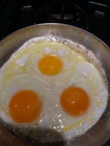 This quote is from one of my favorite books, In Defense of Food by Micheal Pollan. The above picture of my three egg breakfast speaks to this. Two eggs were from truly free range chickens that my God daughter Kathrine raised whereas the third was store bought.