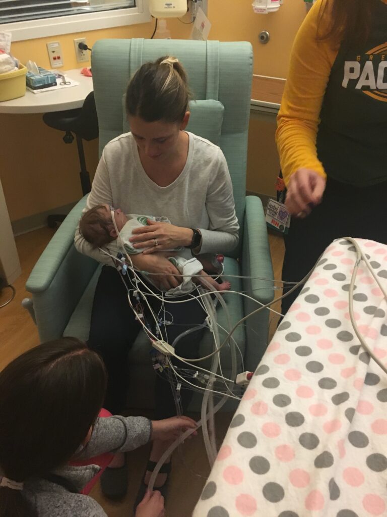 Maya started to go into heart failure at just 5 weeks old and the medicine wasn’t slowing the process down enough, so our little girl went in for her open heart surgery at 7 weeks old. Her heart was the size of a walnut when her surgeon had to open her chest and fix her heart. Thankfully, after nearly 8 hours, she was out of surgery and we could see her. Seeing someone you love hooked up to tubes, wires, monitors, etc is heart wrenching. Seeing your newborn like that is downright awful.