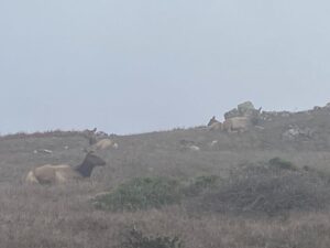 Boy, observing nature is really good for your health. As we were leaving the cows there was a group of six people walking towards us all talking and looking at the trail as they walked. As they approached, we greeted them and I blurted out, “Have you seen any elk?” A woman in the party responded, “Only one, It’s a shame, it is just too foggy.” We all burst out laughing as our friend Kelly was pointing to our left where a heard of elk lie right in front of their eyes.