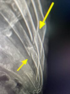 We saw a few broken bones in our office this week as well. You can see in pictures above, the broken ribs on the elderly patient (left) and the broken collar bone on the 6 year old (right). We use a similar protocol to support bone issues such and osteopenia and osteoporosis along with broken bones.